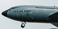 Photo : Un avion ravitailleur KC-135R américain criblé de patchs de retour du Moyen-Orient et pris en photo en Grande-Bretagne. [Capture (…)