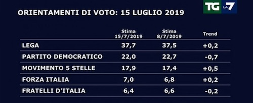 Cette inversion du leadership dans la coalition date d’il y a près d’un an, elle n’a pas trop bougé depuis et a été confirmée par les élections européennes. On comprend ainsi que Salvini lors de futures élections qui auraient lieu à l’automne, pensent qu’il puisse apparaître comme le parti dominant, et bien entendu, si la coalition avec M5S devait être reconduite, il en serait naturellement le leader. La question qui vient tout de suite à l’esprit c’est que si Salvini gagnait les élections que ferait-il de cette victoire, à part se faire nommer président du Conseil ?