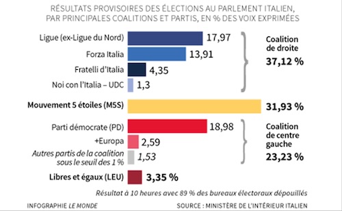Tout cela relève du jeu politicien ordinaire. Là où le scrutin est ouvert, c’est que Salvini pourrait entraîner une dynamique qui le propulse au-delà des 40%. Après tout il a fait preuve de fermeté sur la question des migrants et sur celle du budget. Dans ce cas là il pourrait mettre en place un programme de sortie rampante de l’euro avec l’introduction généralisée des Mini-BOTs qui permettrait de contourner la question du financement des dépenses budgétaires. Personne ne doute que Salvini ne gagne les élections si elles arrivent rapidement. Deux questions se posent alors :
