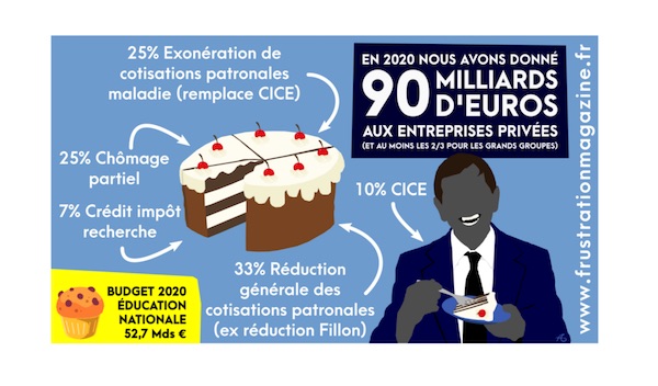 Chaque année donc, les employeurs cessent de payer une grosse partie de ce qu’ils doivent à la Sécurité sociale, le contribuable paye pour eux. A cela s’ajoute le prolongement du Crédit Impôt Recherche (CIR), pour un montant de 10 milliards par an. Au total, nous versons entre 60 et 70 milliards d’euros par an à nos entreprises privées puisque nous payons à leur place ce qu’elles doivent à l’État ou à la protection sociale.