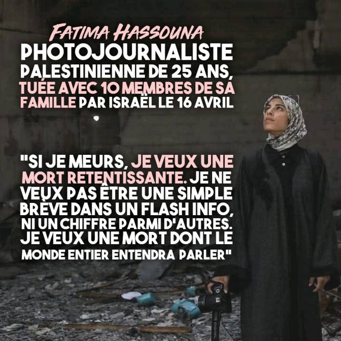 La jeune femme était diplômée en multimédia et documentait, par ses photos et ses vidéos, le génocide à Gaza depuis le 7 octobre 2023. Elle y montrait la réalité brute sur le terrain, la survie des habitants, les bombes, les ruines, la souffrance, alors qu’Israël a interdit l’accès de Gaza aux journalistes étrangers, et a tué 209 journalistes palestiniens depuis un an et demi.