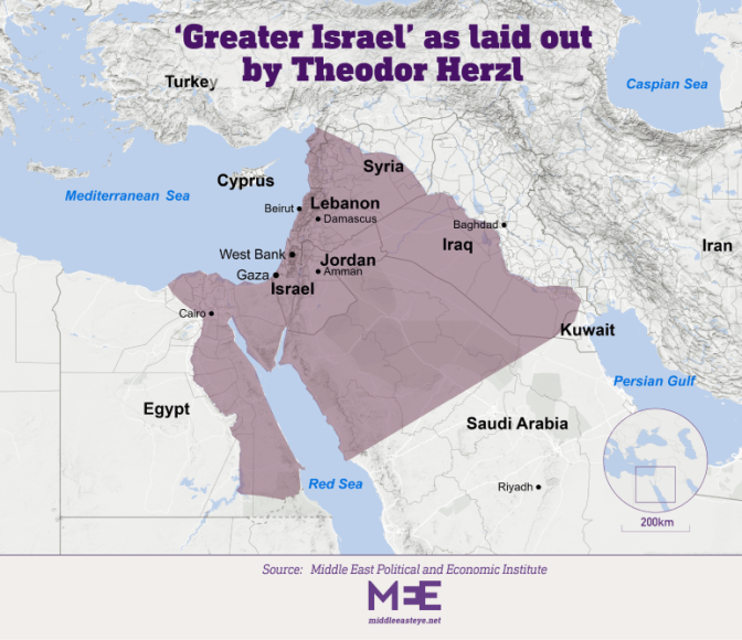Elle prévoit d’étendre la colonisation juive à l’ensemble de la Palestine historique, autrefois prétendument le foyer exclusif des anciens hébreux et promise par le Dieu juif au « peuple élu », ainsi qu’à certaines parties des pays arabes voisins, dont la Jordanie, l’Égypte, la Syrie et le Liban.
