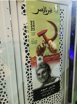 Sur le chemin du retour nous nous arrêtons devant la statue érigée en mémoire de Georges Hawi, ancien secrétaire général du parti communiste libanais, assassiné par une bombe placée sous sa voiture. Forêt de drapeaux libanais siglés de la faucille et du marteau et dépôt de fleurs rouges au pied du monument...