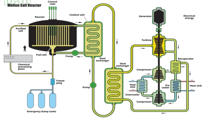 La façon dont cela fonctionne est que vous prenez des sels spéciaux (comme des sels de fluorure) et que vous les chauffez jusqu’à ce qu’ils se liquéfient, à environ 500°C. Ensuite, vous dissolvez votre combustible nucléaire (thorium ou uranium) directement dans ce sel fondu et faites en sorte que la réaction nucléaire en chaîne se produise là dans le liquide – les atomes se divisent, dégagent de la chaleur, réchauffent le sel lui-même.