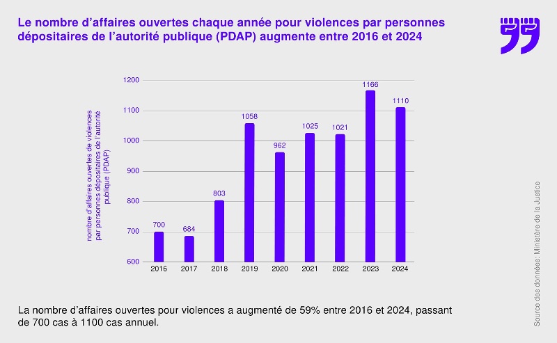Or, si on laisse de côté les chiffres partiels de l’IGPN, le nombre d’enquêtes pour violences policières augmente. Selon les chiffres inédits du ministère de la Justice, révélés par Flagrant déni, le nombre d’affaires judiciaires visant des personnes dépositaires de l’autorité publique (PDAP) est passé de 700 en 2016 à 1100 en 2024.