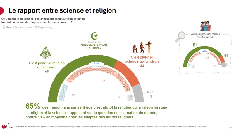 Sur la question de la création du monde, 65 % des musulmans estiment que « c’est plutôt la religion qui a raison » lorsque science et religion s’opposent, contre 19 % en moyenne chez l’ensemble des Français. Cette proportion monte à 81 % chez les moins de 25 ans (52 % chez les 50 ans et plus).