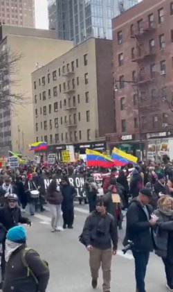 Parmi les slogans scandés : « L’Amérique latine ne vous appartient pas ! » Criant « Plus de coups d’État ! », les manifestants ont dénoncé l’administration Trump pour avoir commis un acte criminel en envahissant un État souverain afin de capturer son chef d’État.