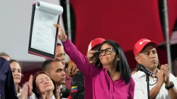 Photo : la présidente par intérim du Venezuela, Delcy Rodríguez, participe à une mobilisation populaire et montre une copie de la nouvelle loi sur le pétrole que les législateurs ont approuvée pour adapter la Loi anti-blocus de 2020.