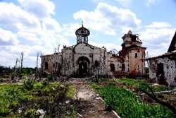 Photo : 18 mai 2015 : vestiges d’une église orthodoxe orientale après les bombardements de l’armée ukrainienne près de l’aéroport international de Donetsk. Est de l’Ukraine. (Mstyslav Chernov. CC BY-SA 4.0, Wikimedia Commons)