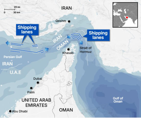 Sa largeur en eau libre, sur une longueur de plus de 100 kilomètres, n’est que d’environ 40 kilomètres. Ses voies de navigation pour les grands navires sont étroites et se trouvent à seulement 20 kilomètres des côtes iraniennes.