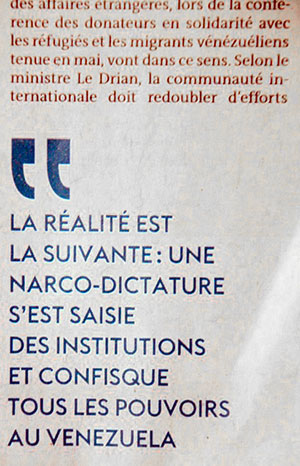 « La réalité est la suivante : une narco-dictature s’est saisie des institutions et confisque tous les pouvoirs au Venezuela ». En fin de dernière colonne, comme il se doit, également rédigée par le quotidien, ce qu’on appelle la « note signature » : « Juan Guaido Marquez est reconnu comme “président par intérim” de son pays par les Etats-Unis, la France et plus de cinquante pays ».