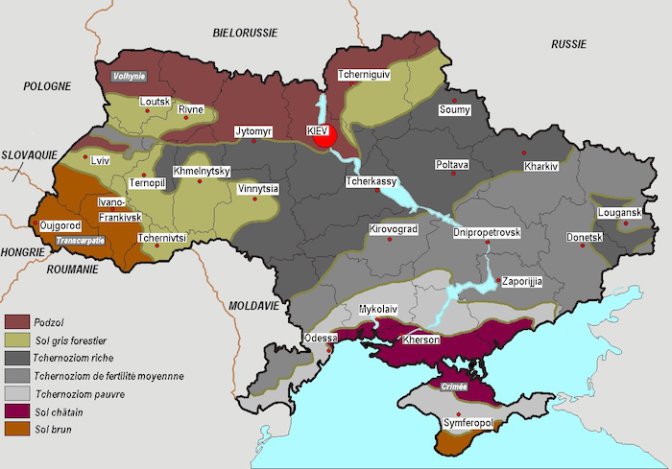 Jusqu’à présent, environ 70% des terres agricoles étaient exploitées en location, ce qui entraînait un sous-investissement chronique et un manque de productivité. Or l’Ukraine est potentiellement le plus grand pays agricole d’Europe : le pays est recouvert à 60% de ce qu’on appelle les « tchernoziom », les fameuses terres noires ukrainiennes (Voir carte ci-dessus). Ce sol est particulièrement riche en humus, et très fertile pour toutes sortes de cultures.