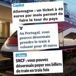 ➡️ Août 2023 toujours : La SNCF propose de payer à partir de 150 euros des billets de trains en trois fois... avec des intérêts de 1,5% à 1,6%. Ce n’est pas une blague. Une offre censée inciter la population à utiliser les transports ferroviaires. Pourquoi pas vendre des organes en échange de billets de TER ?
