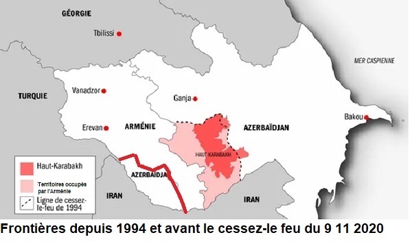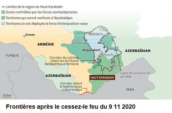 | Il faut rappeler que les deux peuples ont vécu en paix pendant des décennies du temps de l’URSS même si sans doute des velléités nationalistes existaient de part et d’autre pour une région enclavée dans l’Azerbaïdjan où les Arméniens étaient majoritaires. Il a fallu la crise finale de la prestroïka puis la chute de l’URSS, l’arrivée au pouvoir de gouvernements suppôts du capital et des intérêts impérialistes antagonistes dans la région pour que les choses s’enveniment. Si on parle d’épuration ethnique et de la politique azérie dans ce domaine, il faut aussi rappeler que les territoires azéris hors Karabakh occupés par l’Arménie pendant toute la période du "conflit gelé" ont vu la totalité de leur population azérie et kurde expulsée par les Arméniens alors que, au regard du droit international, ce sont quand même des territoires azéris. Certes les épurations ethniques ont autrefois, au début du XXe siècle, touchés les Arméniens et personne ne va nier les souffrances des Arméniens de la part des Turcs, les cousins des Azéris, mais cela ne légitime pas qu’on fasse la même chose "en revanche" cent ans plus tard. Comme le disent les communistes arméniens : « En tant que communistes et internationalistes, nous avons le devoir de nous abstenir de considérer la guerre à travers le prisme du nationalisme sentimental. » Pas plus le gouvernement arménien arrivé au pouvoir suite à une révolution colorée "sorosienne", que le gouvernement azéri guère plus recommandable, ne porte seul la responsabilité du conflit. Ce conflit tombe en plus "à pic" pour quereller la Russie et la Turquie au moment où un début de solution semblait possible en Syrie du nord. Et aussi ce conflit rend difficile la poursuite de la construction de la nouvelle route de la soie. D’un côté, on a Israël qui arme l’Azerbaïdjan "pro-turc" et chiite, et d’un autre on a l’Iran islamique et chiite, mais aussi les Kurdes du PKK, qui soutiennent plutôt l’Arménie même si c’est avec des réticences depuis la révolution Soros. Pour l’ANC les responsabilités dans ce conflit sont partagées et aucun des deux camps n’est sans arrières pensées pas plus que les puissances qui n’ont rien à faire dans la région qui ont mis de l’huile sur le feu pour empêcher les coopérations régionales. Les deux cartes ci-après (qui ne sont pas à la même échelle) permettent de visualiser les découpages territoriaux suite à l’annexion en 1994 par l’Arménie d’une partie de l’Azerbaïdjan et depuis le cessez le feu du 9 novembre dernier.