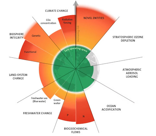 Alors que l’empreinte écologique ne prend en compte que les ressources biologiques que peut nous fournir la planète, un pan entier de notre activité manque. Les pollutions, les dégradations ou encore les atteintes que l’on porte à notre environnement sont absents. Alors si l’on souhaite aller plus loin dans notre prise de conscience, il faudrait regarder également du côté des “limites planétaires”, de ce qui “sort du tuyau de l’économie mondiale“, explique Aurélien Boutaud. Moins connu du grand public, ce concept se focalise quant à lui sur les seuils au-delà desquels les conditions d’habitabilité sur la planète sont remises en question. Parmi les 9 limites planétaires étudiées, 6 sont aujourd’hui dépassées, dont la dernière “l’eau douce” a été franchie en septembre 2023.