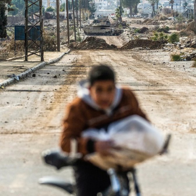 Un garçon portant du pain rentre à bicyclette alors que les chars israéliens bloquent la route menant à la ville syrienne de Quneitra, le 5 janvier 2025. © Mosa’ab Elshamy | AP
