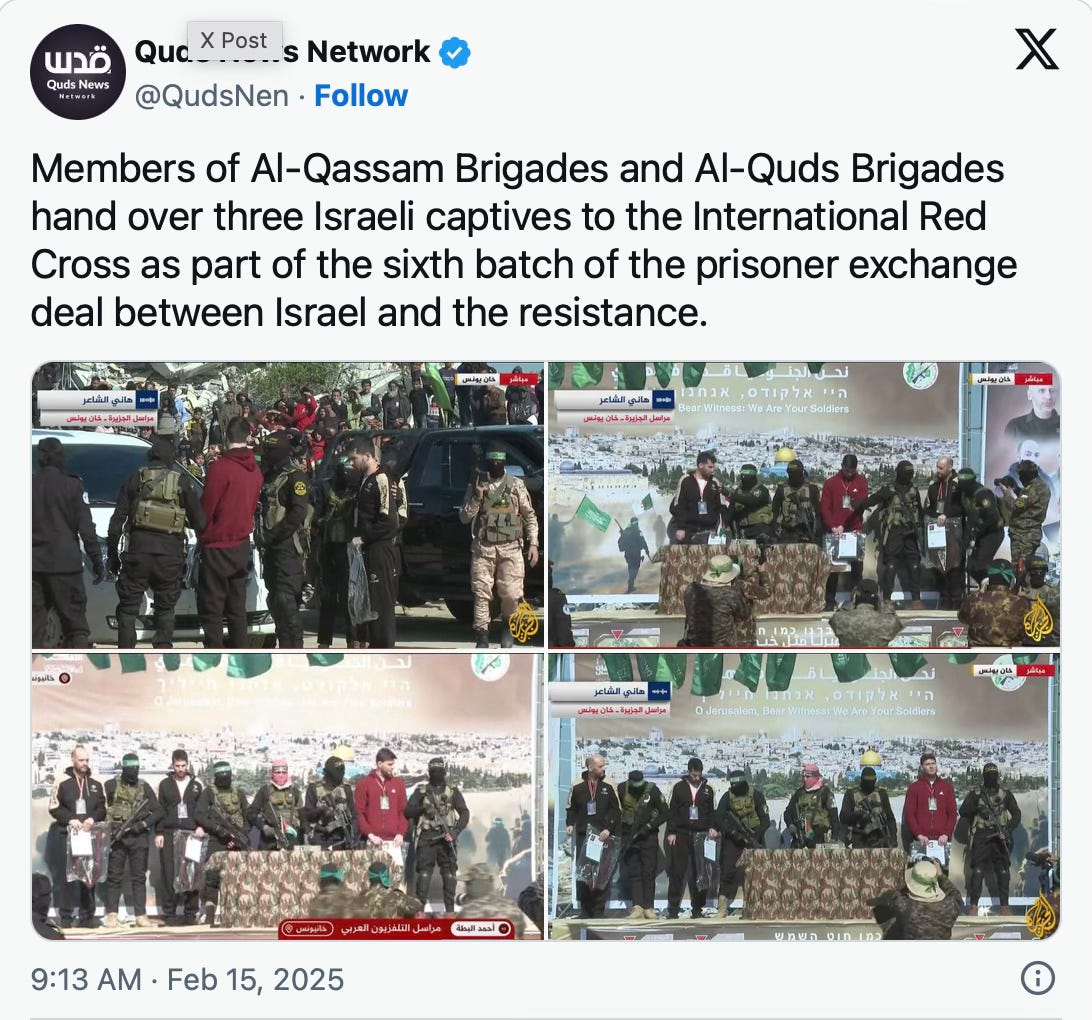 Un peu plus tôt, la branche militaire du Jihad islamique, les Brigades al-Quds, a confirmé la libération d’Alexandre Troufanov dans le cadre de la sixième phase de l’accord d’échange en cours. Les Qassam, la branche militaire du Hamas, ont également confirmé la libération des trois prisonniers.