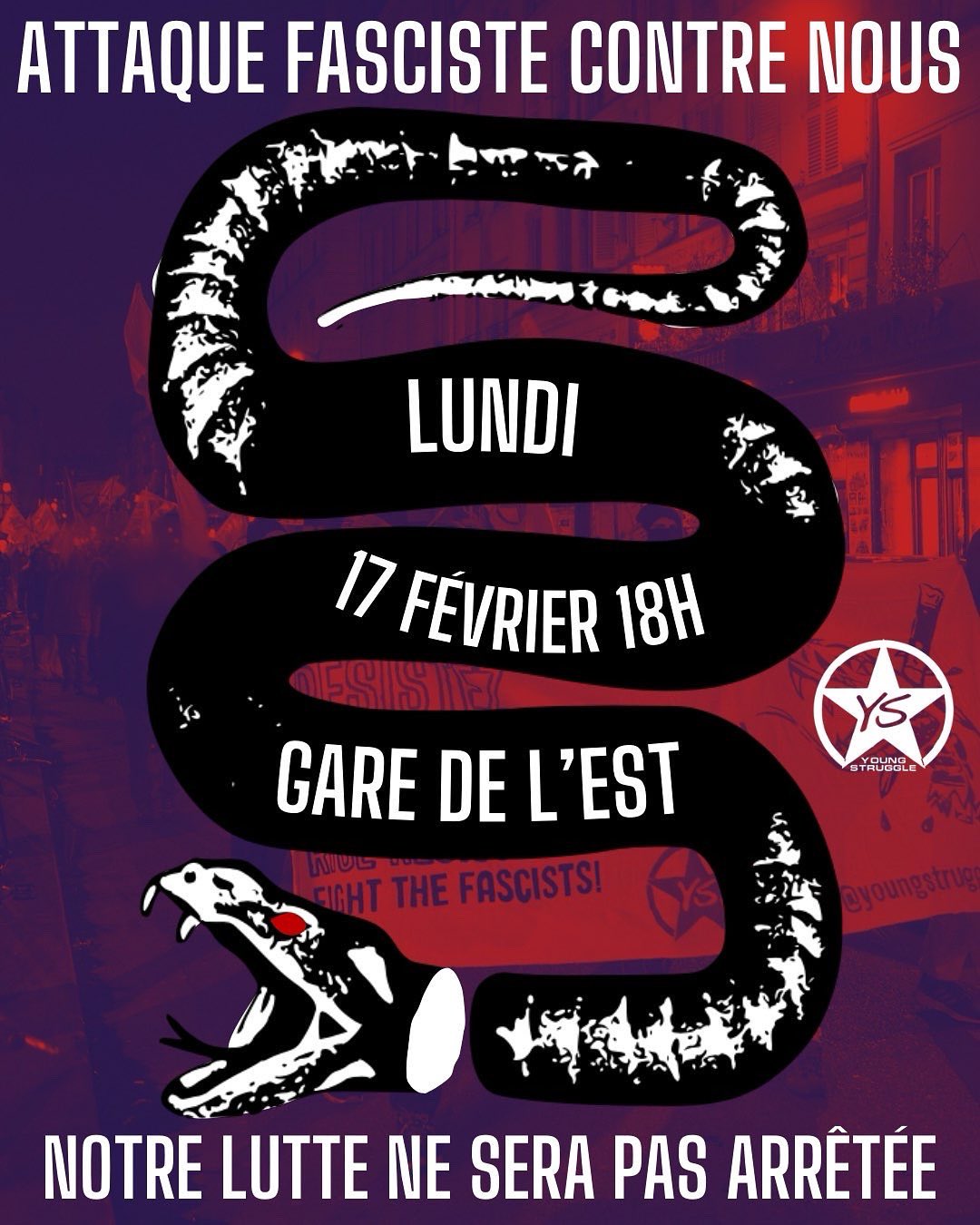 Nous récoltons le slogan « Lève-toi, résiste, détruis le fascisme » de la campagne menée par Young Struggle partout en Europe et nous faisons appel à une mobilisation générale et massive contre l’extrême-droite.