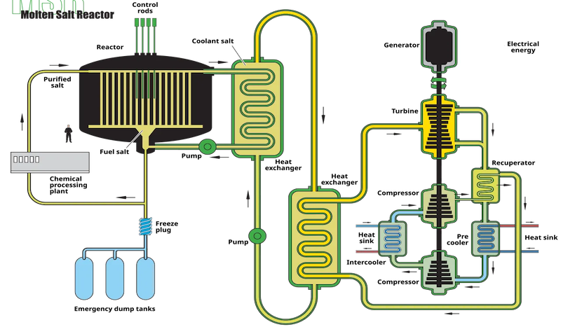 La façon dont cela fonctionne est que vous prenez des sels spéciaux (comme des sels de fluorure) et que vous les chauffez jusqu’à ce qu’ils se liquéfient, à environ 500°C. Ensuite, vous dissolvez votre combustible nucléaire (thorium ou uranium) directement dans ce sel fondu et faites en sorte que la réaction nucléaire en chaîne se produise là dans le liquide – les atomes se divisent, dégagent de la chaleur, réchauffent le sel lui-même.