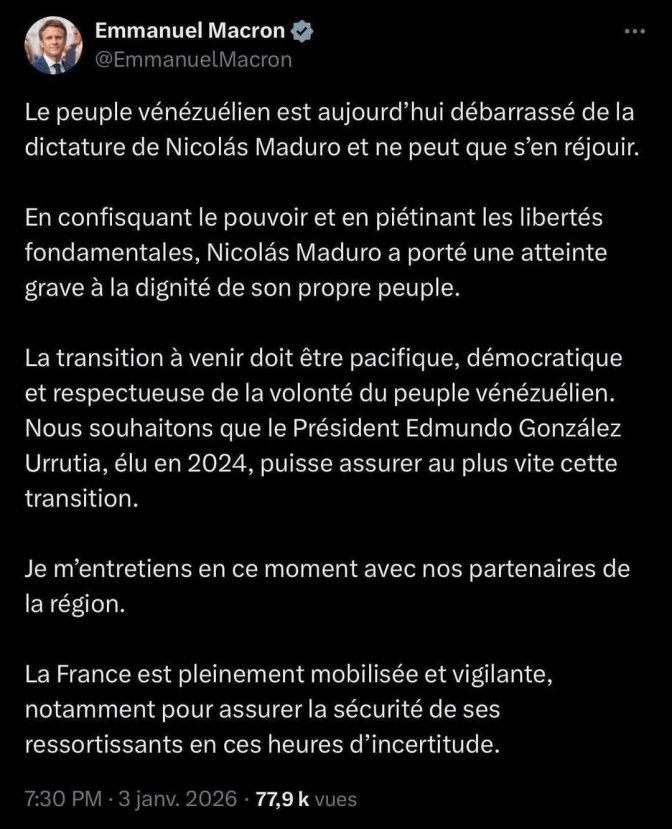 | *Macron la vermine est un titre inspiré par un livre de Maurice Lemoine sur le Venezuela Juanito la vermine Et maintenant il ne manquerait plus que Trump nous propose comme présidente la Prix Nobel de la Paix, María Corina Machado, l’opposante pro-israélienne qui pourrait tirer profit de la chute de Maduro. La boucle serait bouclée ! (JP) |