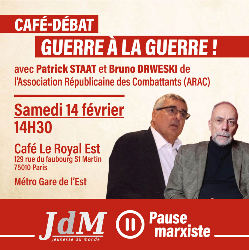 Nous serions heureux de vous accueillir le Samedi 14 février à 14h30 à un café-débat "Guerre à la guerre" qui se déroulera au Café Le Royal-Est