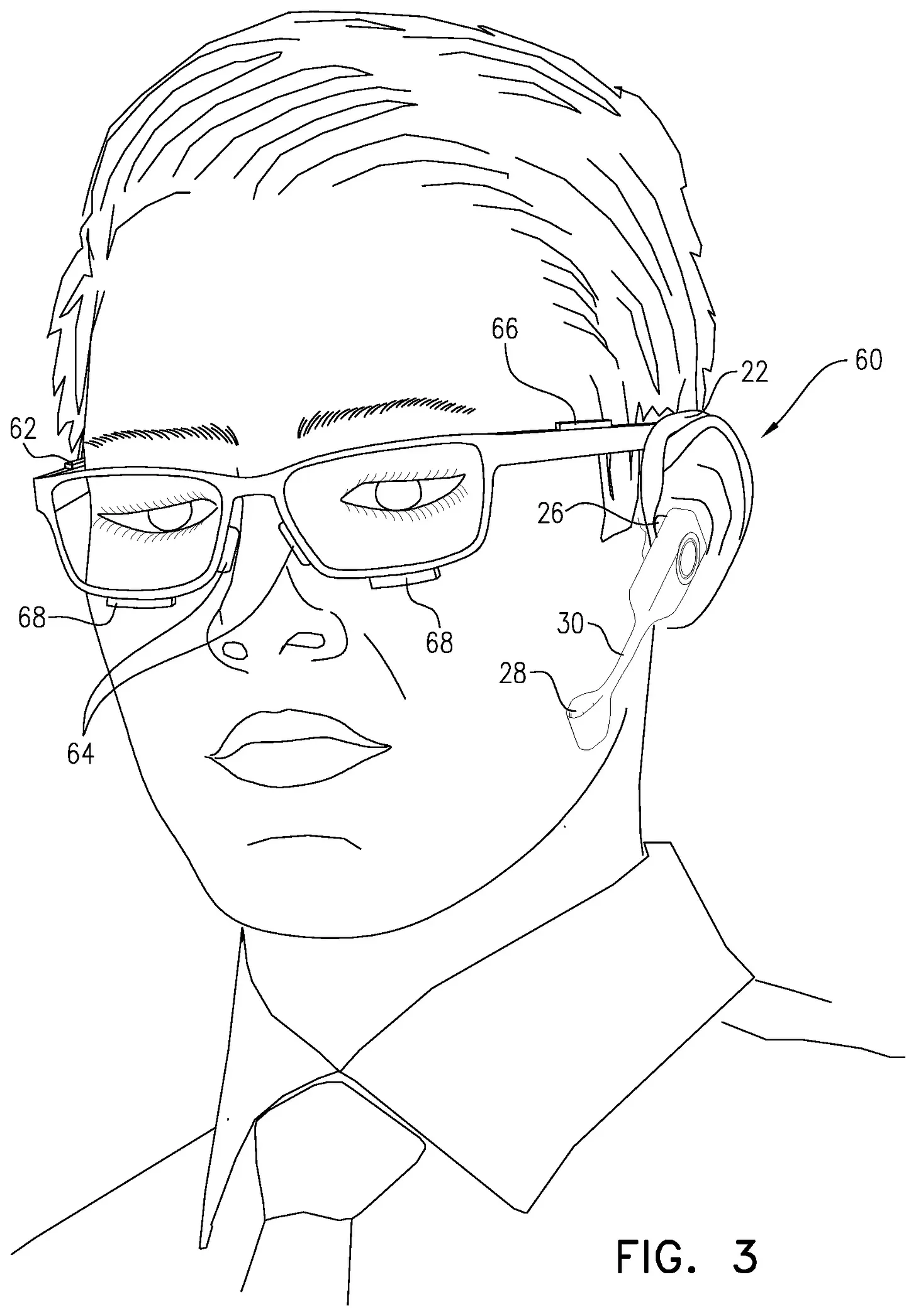 Un schéma commenté inclus dans le brevet montre une personne portant des lunettes et une oreillette dotée de cette technologie.